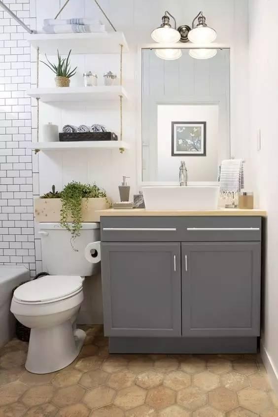 假如你觉得封闭的橱柜不好看,那就做成开放式的也可以啊,不过考虑到卫生间的水汽比较大,可以做成这种半封闭一半开放的、开放的区域放清洁用品,封闭柜子里放容易受潮的卫生纸等。