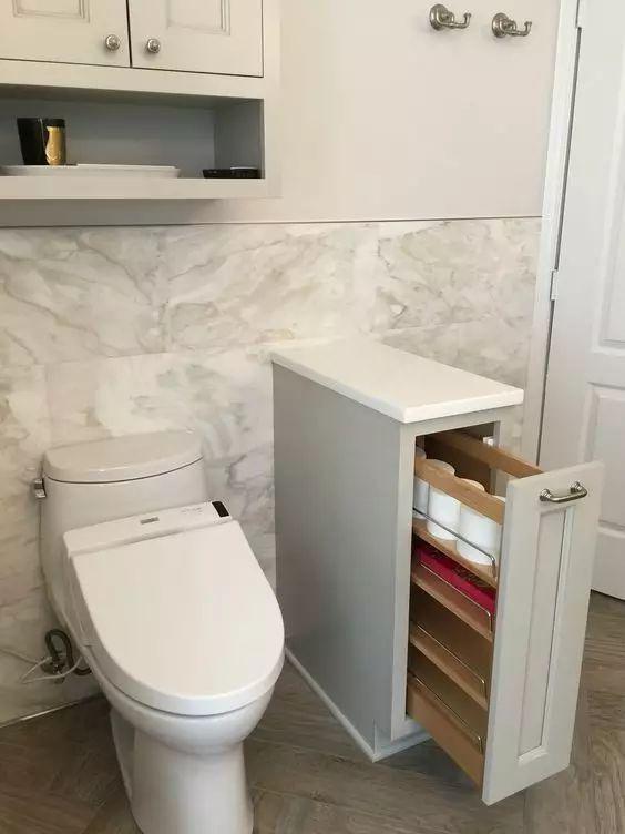 千万别忘了在卫生间旁边做扶手,如果家里有老人的话!砖块可以比较费时费力,那么直接做一个抽屉式的橱柜就方便多了,这样可以利用背景墙和侧面空间,还挺有新意的吧!