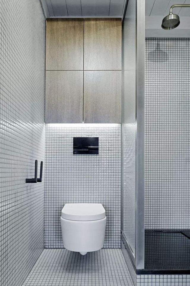 很多人把马桶盖后面的墙壁空置起来,这是一种明显的浪费!实际上我们可以利用它作为收纳空间来使用。如上图做成玄关鞋柜的上下轨,把台面中间留有一条灯带,是美观又实用吗?橱柜内放卫生纸和清洁用品,台面可放置香熏。