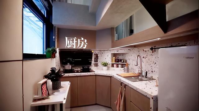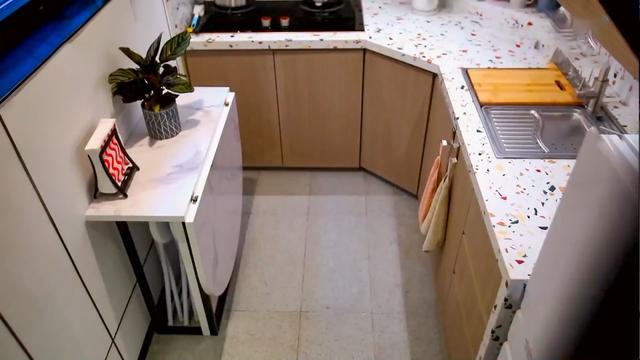 改造后的厨房,不仅增加了油烟机的空间,还有更多的杂物收纳空间,厨房里还有一张多功能餐桌,这里平时也是一个小吧台,打开后可以满足四口的用餐需求。