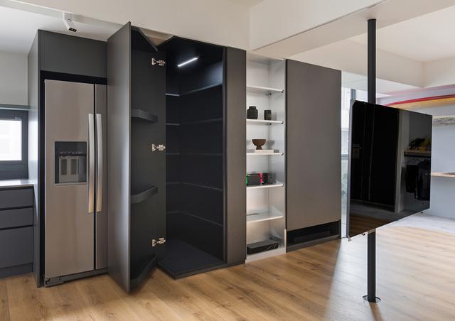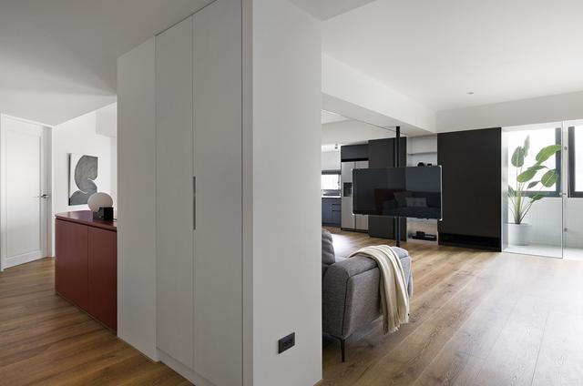 一台电视机被安装在一个电视柱上,可以360度观察角度。可以说起居室抛弃了茶几和电视墙,争取到了更大的视野和活动空间。与此同时,在电视机的后面,定制了储物柜,加强了家里的收纳功能。