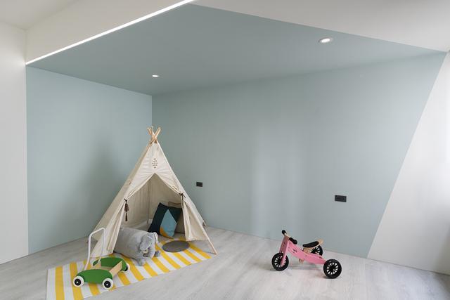 鉴于孩子还小,在儿童房没有直接布置家具,直接让儿童房变成了儿童游乐的空降。用天蓝涂料打造的不轨者几何造型,让空间变得更生动有趣。