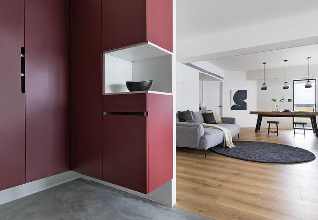 一推门,一抹吸睛的酒红色便映入眼帘,这是玄关定制鞋柜。正门上方的鞋柜中间设计有镂空的空间,打造出一道入口,让进门就能收获一份惊喜。L形的鞋柜还很好的保护了起居室的私密性,对于风水也很不错。