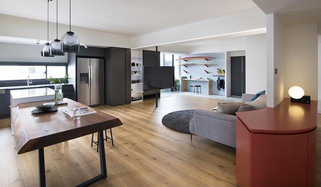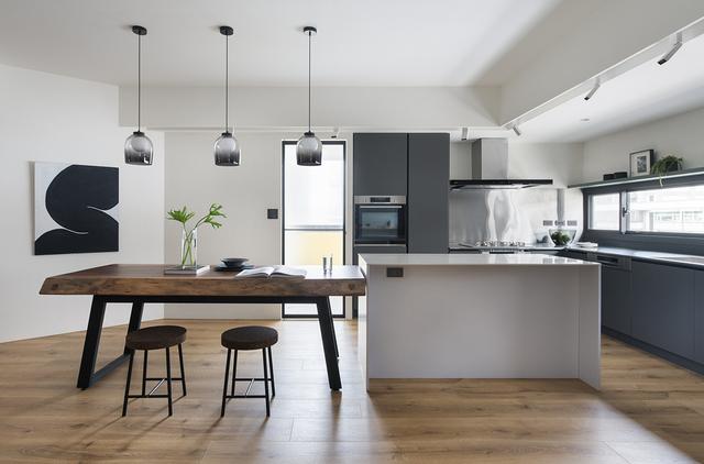 主人和主人都喜欢下厨,一个开放式的厨房可以满足他们拥有宽敞的空间的需要,同时开放的厨房可以实现直接沟通,增加两人的亲密时光。桌子从中央的岛台伸展开来,丝毫不觉得突兀。