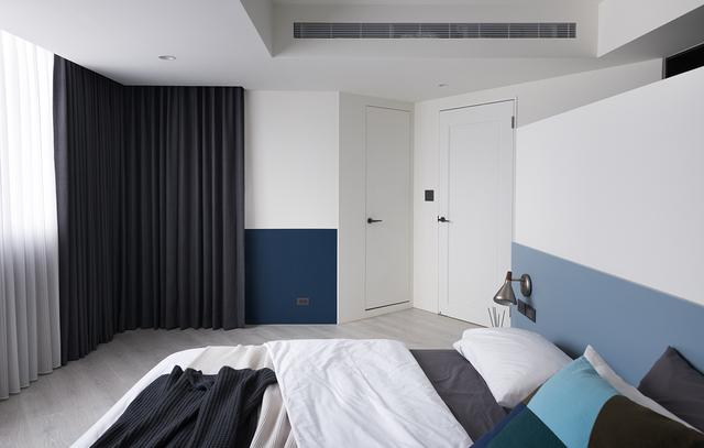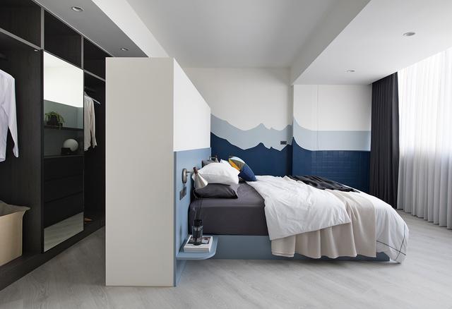 主卧室虽然起初看起来有点普通,但很耐看。简洁明了的白与蓝系搭配本来就很清新。主卧室和衣帽间以半高墙设计分隔开来,使空间以一个式适方便的洄游路线。