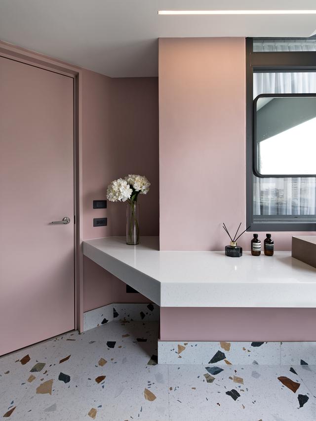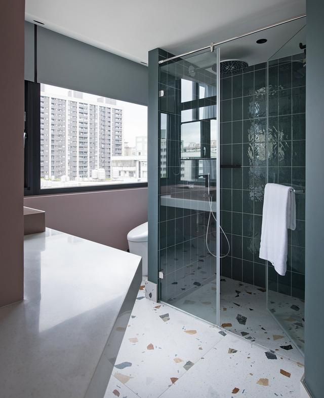 整体主卫也是呈现一种舒适的气氛,粉红色搭配墨绿,空间气氛显得甜而不腻。主地板采用的是磨石地砖,色彩的色彩让空间具有更多的趣味。主空间采用玻璃作为隔断,创造出良好的干湿分离。