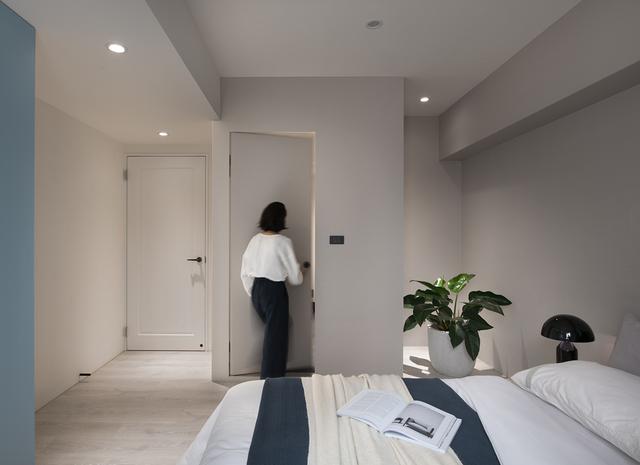 床背的背景墙实际上是一个嵌入式柜子,无拉手的设计让整个平面整洁统一。这一区域也勾勒出一条简洁的迁徙路线,然生活中的动线变得简单舒适。