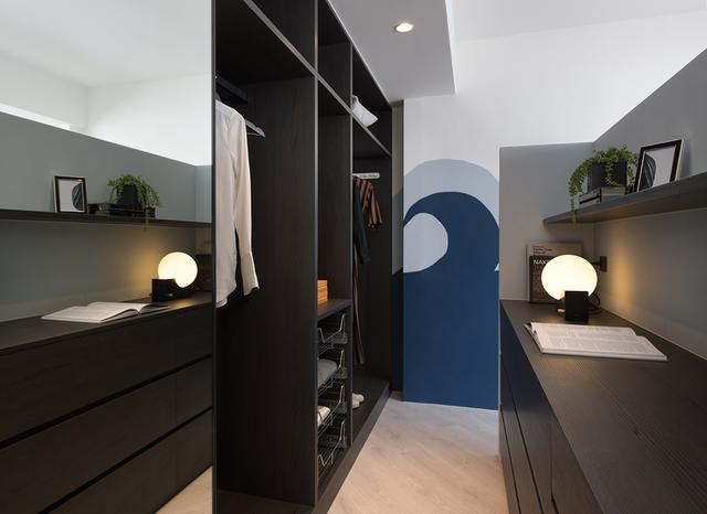 半壁后的衣帽间,可作为日常梳妆、办公用品,设计舒适合理,也让空间有了不同的功能。