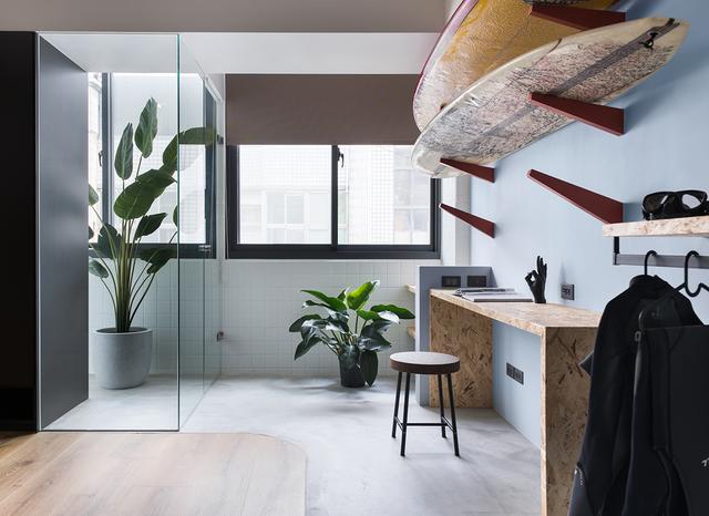 办公室是男主人的最爱,因为办公区配上他最喜欢的冲浪板。简洁而开放的办公空间被天蓝色点缀,让冲浪板犹如在大海中漫游,在工业方面也是充满激情的。
