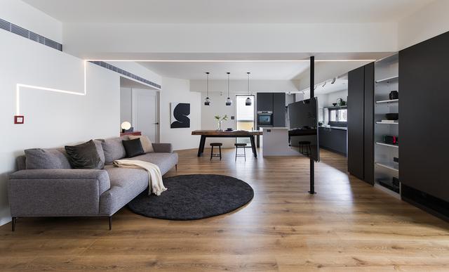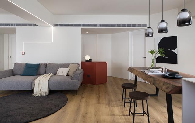 在起居室的沙发上有一条横梁,设计师用灯带消除横梁带来的压迫感,同时明亮的线条延伸至沙发,勾勒出线条感。