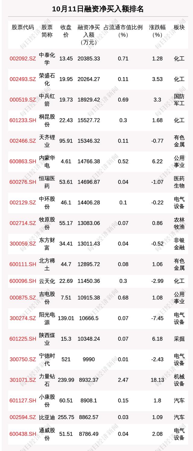 每经AI快讯,据交易所最新公布的数据显示,截至10月11日,沪深两市的融资融券余额为18582.47亿元,环比增加40.2亿元,其中融资余额16995.67亿元,环比增加34.41亿元。从融资资金净买入金额来看,共有15只个股净买入金额超亿元,其中中泰化学、荣盛石化、中兵红箭排名前三,买入金额分别为2.04亿元、2.03亿元、1.89亿元。