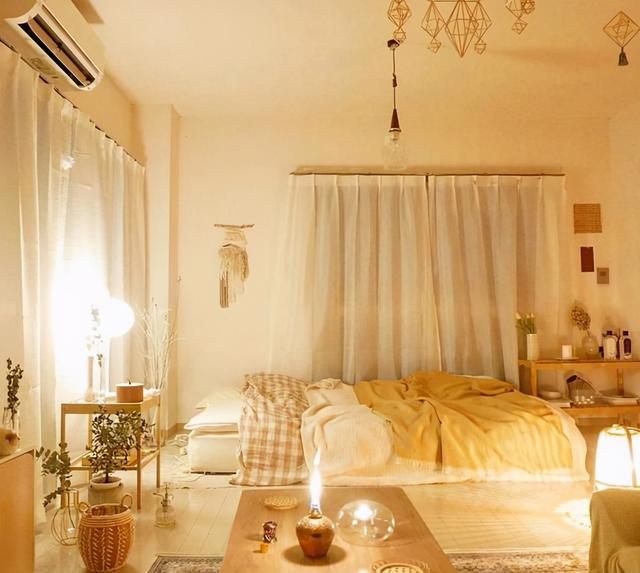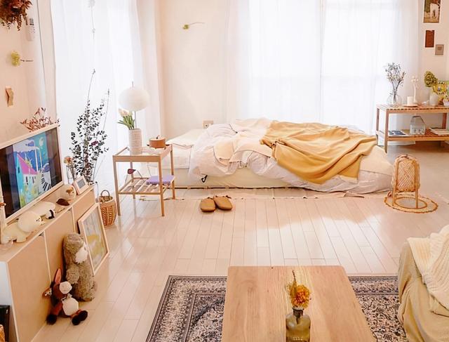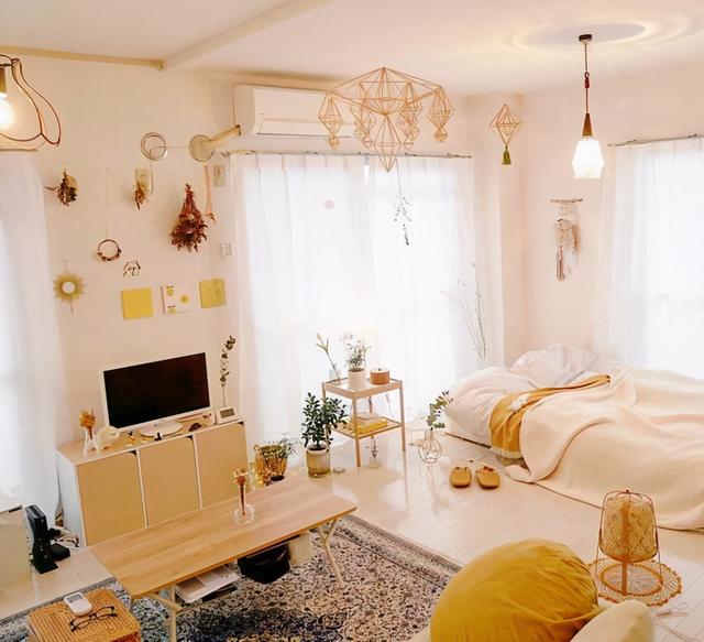 主人是一位刚毕业的少女,从卧室、厨房、走廊、阳台到阳台都是她亲手布置的,温暖清新。主色选择了暖色的暖黄色,屋内的每一件都是很柔和的主色调。空间中没有放床架,直接铺上厚实的床垫,许多年轻人就喜欢这样,随便一坐一爬,一天就过去了。