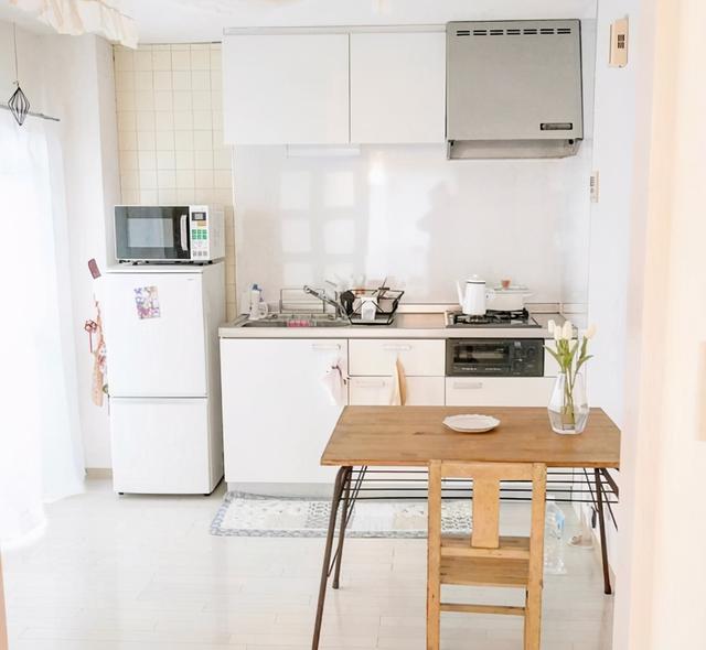 厨卫空间也很大,一字型简单的橱柜,迷你小冰箱,一侧空间刚好放置,在这里烹饪莫名有一种安全感。