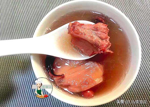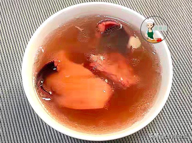 出锅盛碗即可上桌享用,这样一道家常版的:莲藕章鱼骨头汤就做好啦,这样煲出来的汤鲜香甘甜,莲藕粉糯、猪骨软烂鲜香,还有章鱼干的鲜甜,花生的粉糯,这几样食材搭配在一起煮汤,鲜香甘甜又滋补,秋燥天进补喝它再合适不过了,滋补润燥还不上火,女人常喝还能滋补气血,气色红润人更美,比化妆品强多了,小孩长身体也可以多喝,补钙长高个,女人孩子喝特好。天凉了我家隔三岔五准煲一锅,每人喝一碗特养人。简单营养滋补的做法分享给你,喜欢可以收藏试试哦。