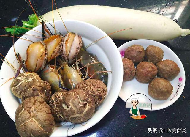 准备食材:白萝卜、鲍鱼、大虾、牛肉丸、蛋饺、白切鸡、香菇。