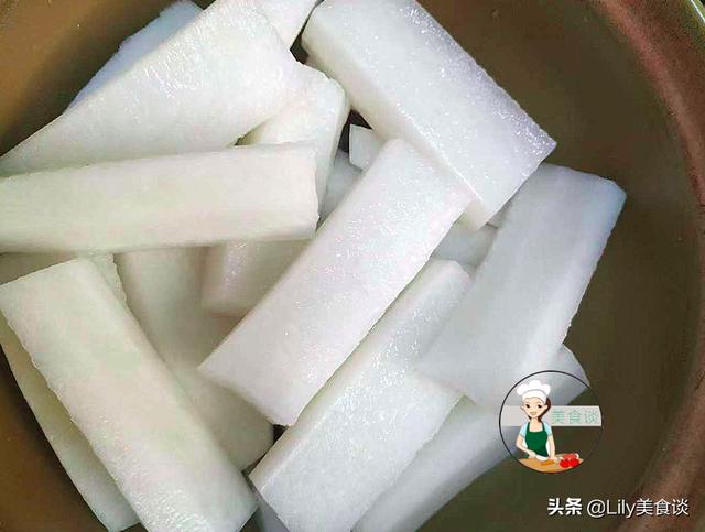 2、准备一个烧锅,在锅底铺上一层白萝卜块。(白萝卜铺在锅底吸收食材的味道吃起来更鲜甜)。