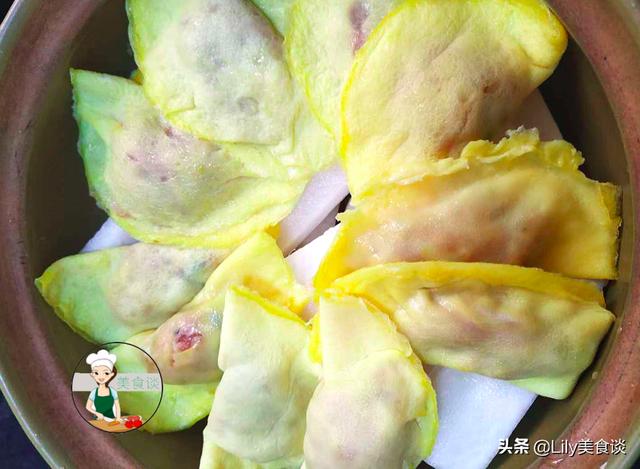 3、然后摆上一圈的鸡蛋饺子。(鸡蛋饺是用蛋皮包饺子肉馅制作而成的)。