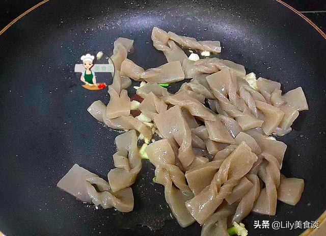 4、下入焯水过的魔芋花卷下锅翻炒均匀。