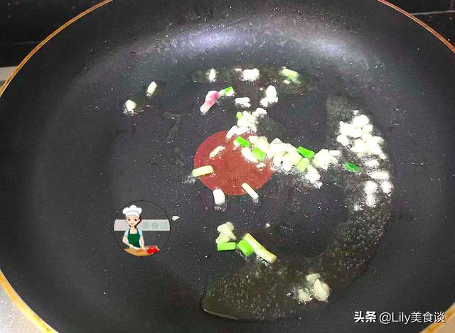 3、热锅凉油,下入蒜蓉和葱白下锅煸炒出香味来。