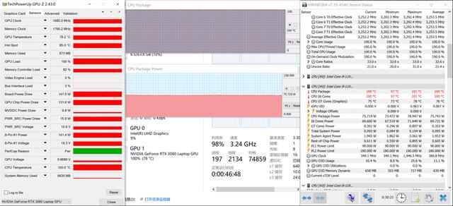 室温25℃左右,利用Aida64和FurMark对掠夺者战斧500进行双考测试(采用野兽模式,以模拟用户玩游戏时的情况),半小时之后的情况如下所示:i9 11980HK处理器的封装功耗约为75W,频率在3.24GHz左右,处理器实时温度为100℃;RTX 3080的功耗约为150W,频率1680MHz左右,温度在79.2℃附近。
