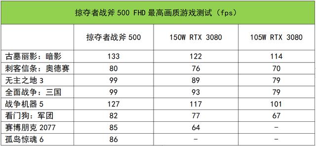 在FHD游戏对比实测中,掠夺者战斧500搭载的满功耗版RTX 3080相对105W款有大幅度领先,不少游戏都达到了20%以上,比如《无主之地3》《战争机器5》等,和图形基准性能测试比较相符。同时大家也可以看到,相比功耗相近的150W款RTX 3080,掠夺者战斧500也有较为明显的优势。另外,《赛博朋克2077》作为笔记本显卡杀手,甜品级的满功耗RTX 3060在FHD下最高画质平均帧速是59fps,而旗舰显卡RTX 3080则是85fps,从中可见不同型号显卡之间的性能差异。
