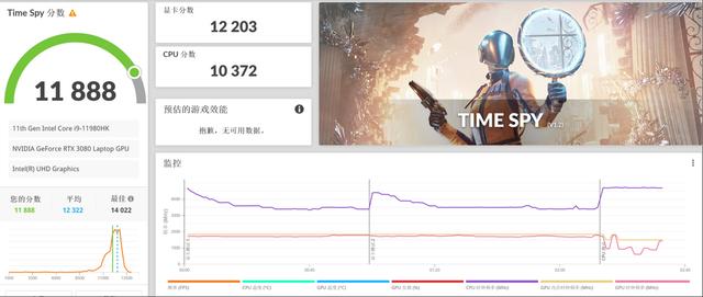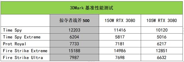 从3DMark的基准测试结果来看,掠夺者战斧500搭载的满功耗版RTX 3080很强力。在Time Spy测试项目中显卡分数为12203,相比105W款的RTX 3080领先幅度达到了19.5%,相比150W款RTX 3080则有6.8%的提升。而在Fire Strike Extreme测试项目中,掠夺者战斧500显卡分数达到了15188,相比105W款RTX 3080提升幅度为18.1%。
