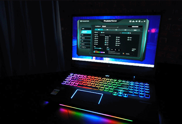 ▲键盘面值得细说,上方的开机按钮、中间的按键区域、下方的触控板全部都有灯效,涵盖了玩家能看到触摸到的绝大部分部件。而且顶尖游戏本的灯效可玩性都很丰富,具体到掠夺者战斧500的键盘,每一个按键都可以自定义颜色。同时,键盘灯、环形光束不仅内置了多种系统预设效果(如大家熟悉呼吸、波纹、水流等),还支持音频同步和屏幕同步,灯光可随着玩游戏、听音乐、屏幕内容的变化而变化,很有趣!而这一切灯光效果,玩家都可以在掠夺者感应系统里(启动按键位于数字小键盘区域)进行设置,简单方便。