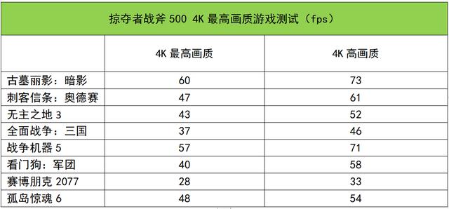 接下来我们继续加大测试压力,将屏幕分辨率提升到掠夺者战斧500的原生4K下,测试画质分为预设最高画质和高画质。在4K最高画质下,不少游戏的平均帧速处于40~60fps之间,部分可玩,但部分游戏流畅度一般。降低特效到预设高画质下,大部分游戏的处于50~70fps之间,帧速提升不错,可较为流畅的体验3A大作。也就是说,满功耗的RTX 3080,在4K高画质下运行3A大作是没有太大问题的。