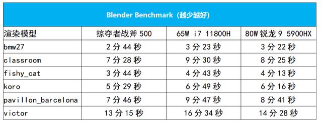 接下来再看看掠夺者战斧500在长时满载下的性能表现,依然采用Blender六个场景连续渲染测试,测试环境为“涡轮模式”。牛叔观察了该机在实际渲染时的处理器功耗,重点来了——如下所示,i9 11980HK的实时功耗达到了笔记本里恐怖的120W!并且这不是瞬时功耗,注意功耗曲线非常平滑,也就是说基本稳定在120W左右,而处理器频率也来到了极高的4.46GHz,距离全核最高睿频4.5GHz也差不了多少。从这里可以看出,即便是在对处理器要求极限的在满载渲染性能上,掠夺者战斧500也丝毫不怂,基本释放了i9 11980HK的所有性能,测试也就毫无悬念地超出了其他处理器的成绩。