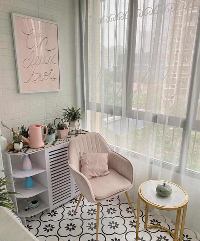 露台是一个小型的休闲区和晾晒区,白色复古花砖非常文艺,轻奢的靠背椅和小茶几,让空间变得懒散。