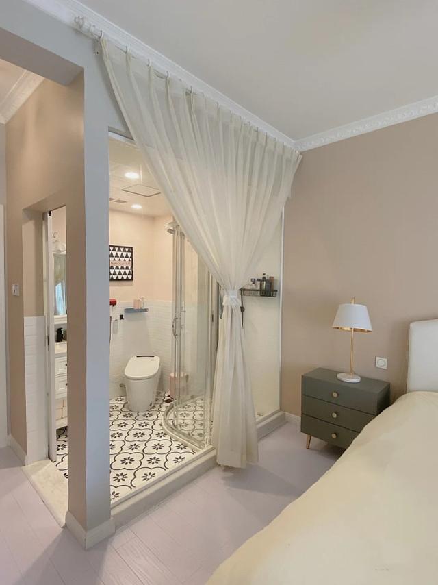 白纱后面是主卫,这里将一面墙大部分拆掉,玻璃作为隔断,若隐若现的朦胧美感,真让人向往啊。卫浴间采用谷仓门的设计,使空间更宽敞。