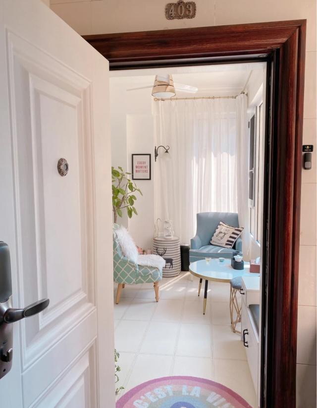 起居室和入户阳台之间用白色玻璃门作隔断,采光也可以很棒,形成一种隔着不断的空间美感,清新简洁。