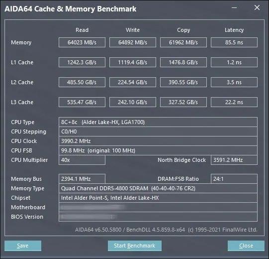 AIDA64双通道模式实测显示,金泰克DDR5-4800笔记本内存读取速度超64GB/s,写入接近65GB/s,拷贝接近62GB/s,延迟为85.5ns。