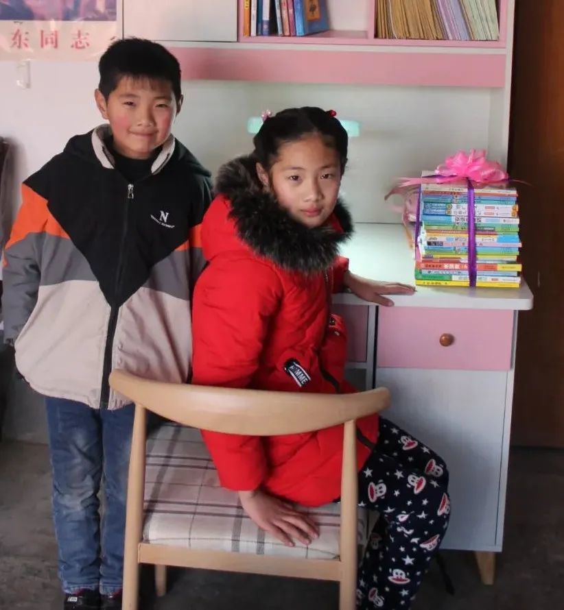 去年年底,佳佳的心愿是想要一件棉服。为了能够多穿几年,身高150cm的她特地注明棉服的号码要170号。因为品学兼优,经过学校的推荐,佳佳除了棉服外,还获得了公益组织捐助的一套“红领巾小书房”,包括学习桌、台灯和书籍,粉色的书桌令佳佳特别喜欢。今年春节前,公益组织买上新年贺礼,专程到佳佳家中看望。姐弟俩都特别开心。