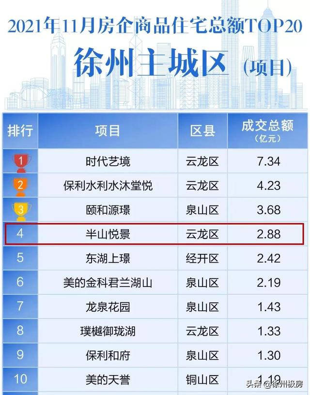 其中11月第1周徐州商品住宅销售金额TOP10中,半山悦景在销售金额、面积、套数排名中均位列首位!