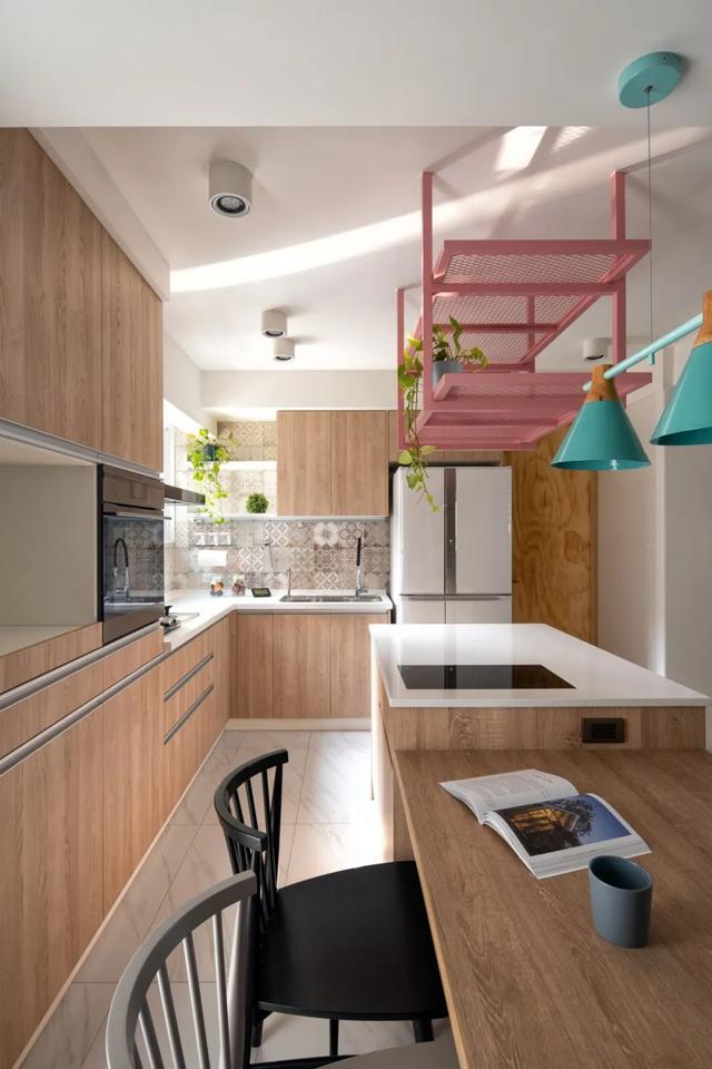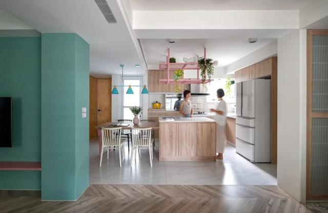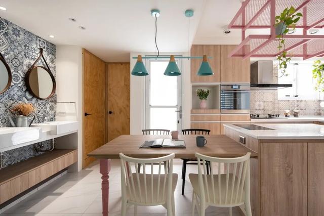 餐厅的杏仁饼色和原木色的岛桌搭配得很好,让小资的心情融入生活。