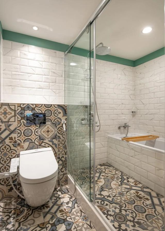 浴室铺着复古风格的瓷砖,墙壁是白瓷,看起来很有层次感,给浴室一种别样的风格。设计师还在浴室内设置了干湿分离装置,方便日后使用。