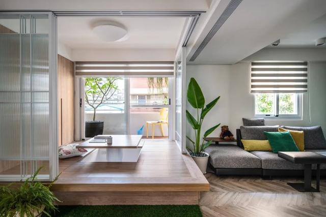 在靠近阳台的区域,是日式原木风休闲区,在这里搭建了隐藏平台,可以充分满足茶室和娱乐区的功能。