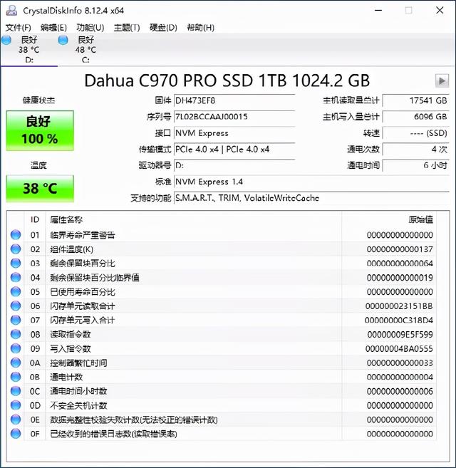 大华C970 PRO固态硬盘在CrystalDiskInfo软件识别中,可以清晰地看到传输模式为PCIe 4.0 ×4,符合NVMe 1.4传输标准,支持S.M.A.R.T,TRIM,VolatileWriteCache。还有详细的系列号以及固件版本,用户可以通过相关编号查询是否为正品。