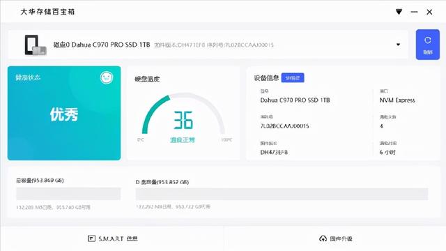 我们都知道,PCIe 4.0 SSD的发热量大,SSD的温控水平直接决定着数据传输过程中的稳定性。从大华存储百宝箱工具界面中,我们看到在待机状态下,大华C970 PRO固态硬盘的温度稳定在36℃,表现优秀。