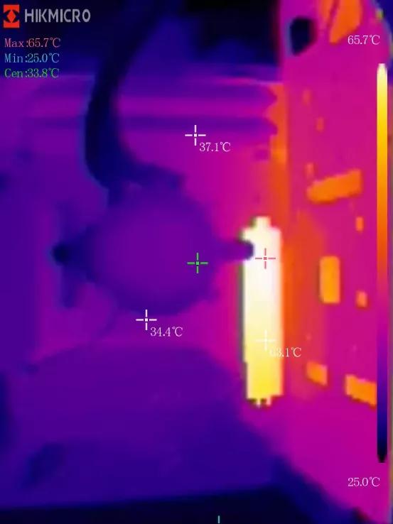 在大华C970 PRO固态硬盘进行数据写入时,从热成像测试软件中可以看到,这款产品最高温度为65.7℃,低温区域63.1℃,在竞品中温控效果同样优秀。