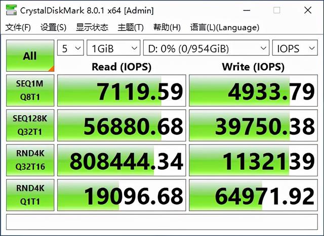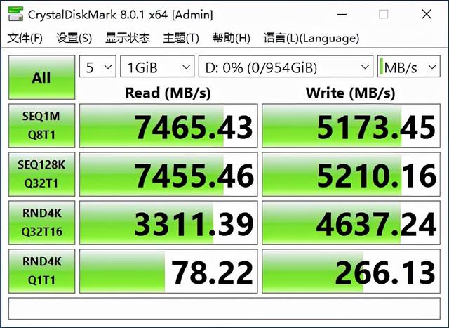 在CrystalDiskMark 8.0.1 x64测试中,大华C970 PRO固态硬盘顺序读取速度达到了7465.43MB/s,顺序写入速度也高达5173.45MB/s,4K多线程顺序读写分别得到了808444 IOPS和1132139 IOPS(不同平台测试成绩存在一定差异)。