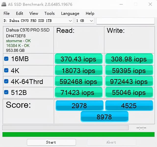在AS SSD Benchmark 测试中,大华C970 PRO固态硬盘的随机读取速度达到5926.89MB/s,随机写入速度达到4943.65MB/s,总分达到了8978分,4K多线程的写入性能达到了972443 IOPS。我们都知道,在应对大量文件传输时,4K写入性能越强越能提高效率。大华C970 PRO固态硬盘接近1000K IOPS的速度充分展现了国产PCIe 4.0主控的实力。