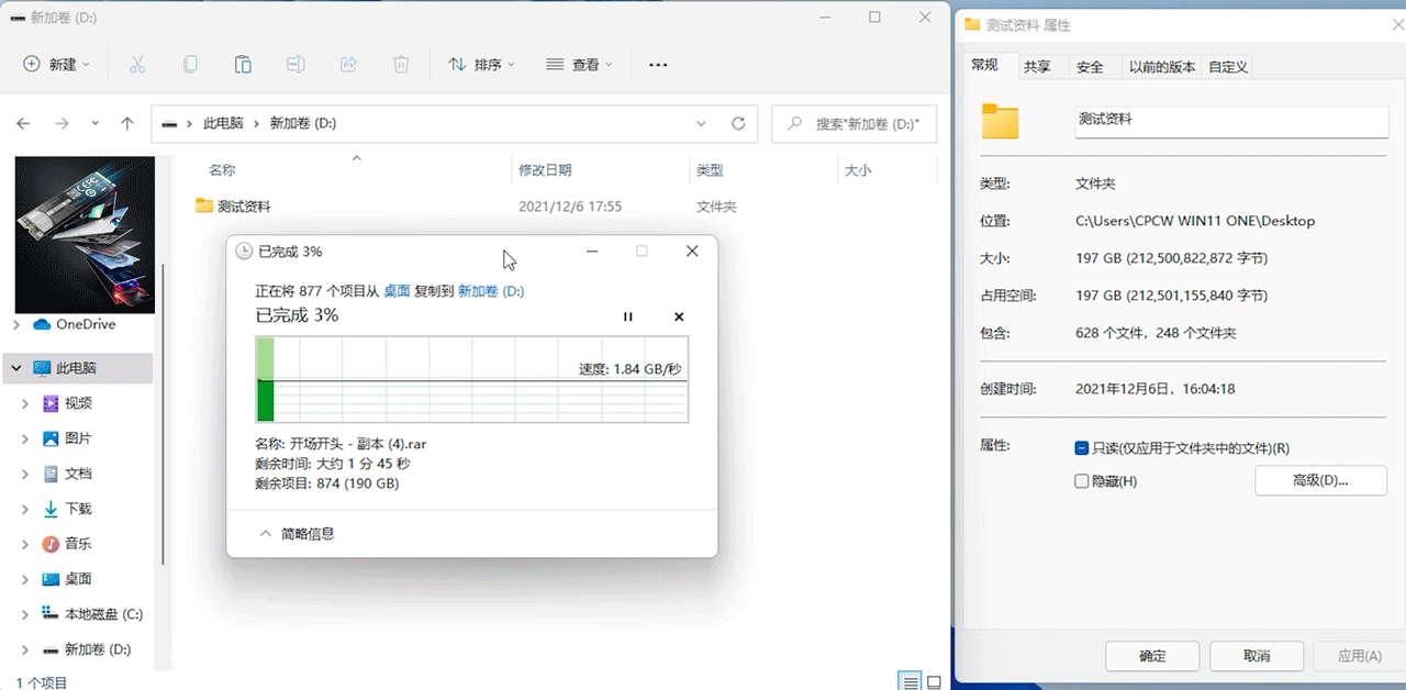 在实际拷贝测试中,应对包含628个文件,248个文件夹,总容量为197GB的零散文件传输时,瞬时速度在1.8GB/s左右(传输过程中启动录屏会影响到SSD实际拷贝速度,实际速度高于测试成绩),传输稳定;而在拷贝单个容量为9.3GB的文件时,平均2883MB/s的速度瞬间传完。从这一点可以看出,大华C970 PRO固态硬盘的确在给用户提供稳定传输体验的问题上下了很大的功夫,而这恰恰是消费者所需要的,谁也不想SSD用着就掉速。