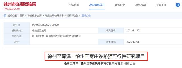 近日,徐州市交通运输局官网发布徐州至菏泽、徐州至枣庄铁路预可行性研究项目招标公告。