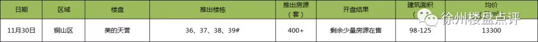 据不完全统计,徐州市区上周共有1家楼盘开盘,共计推出400多套房源,来自铜山区。