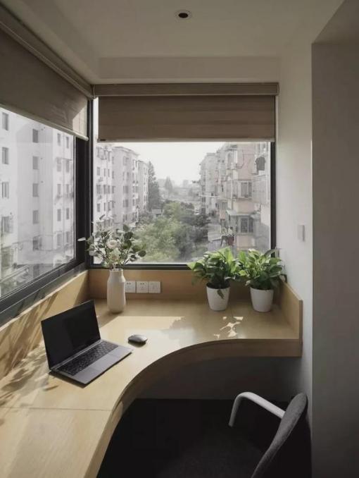 阳台空间定制了悬空的书桌台面,窗户上安装了升降窗帘,摆放了几盆绿色植物,营造出舒适自然的办公学习空间。