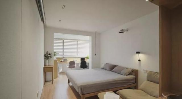 卧室的木地板刷成了大白墙,布置了一张实木双人床躺椅,角落还有一张木桌,搭配绿色植物和活动空间,营造出简单舒适的休息环境。