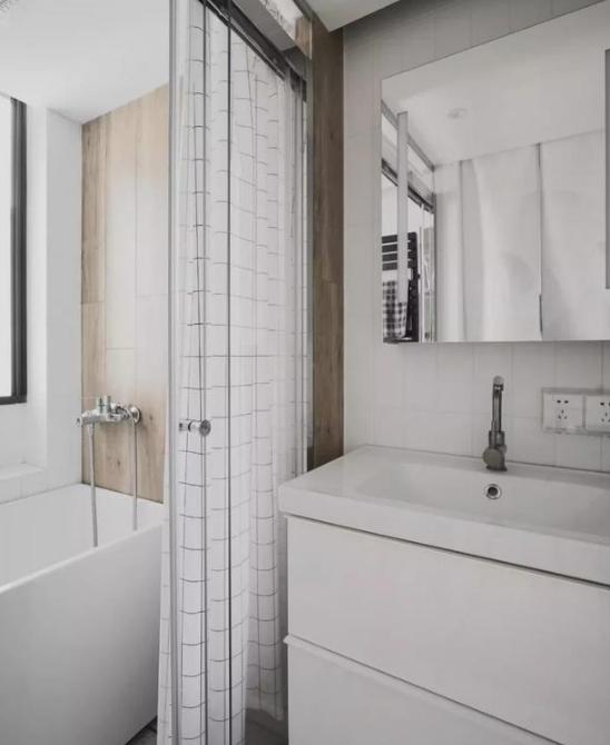 洗涤区安装了白色悬挂式浴室柜镜柜,简单自然,美观实用。淋浴区设计浴缸,安装玻璃隔断进行干湿隔离。玻璃隔断配合浴帘,保证私密性,使用时互不影响。