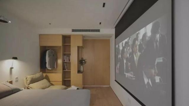 床的墙上安装了一个升降投影仪。关上卧室门,打开投影仪,就可以在床上欣赏电影了,再也不用去电影院了。